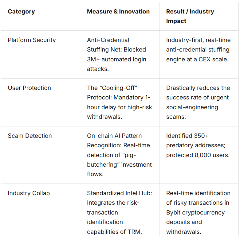 Bybit指出,在上一季度该系统还识别了350个高风险的投资诈骗地址,并帮助8,000名用户避免了潜在的提币损失。此外,整个2025年中,它成功抵御了超过三百万次黑客凭证填充攻击。
