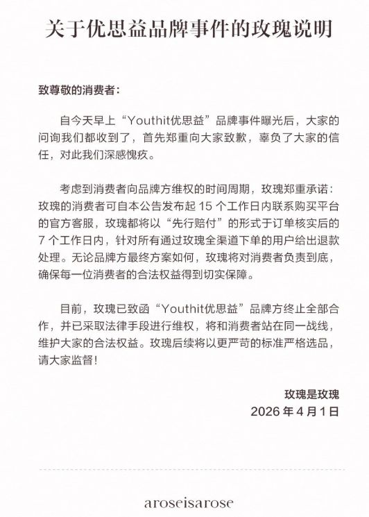 头部主播章小蕙及其品牌店铺曾推销该产品。在事件发生后,“玫瑰是玫瑰”的官方渠道宣布,所有通过该平台购买此产品的消费者将获得全额退款或赔偿方案,并要求消费者在一个半月内联系客服提交订单号以完成赔付流程。