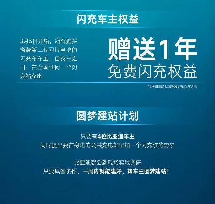 所有购买第二代刀片电池闪充车型的车主,在购车后一年内可享受免费充电服务;