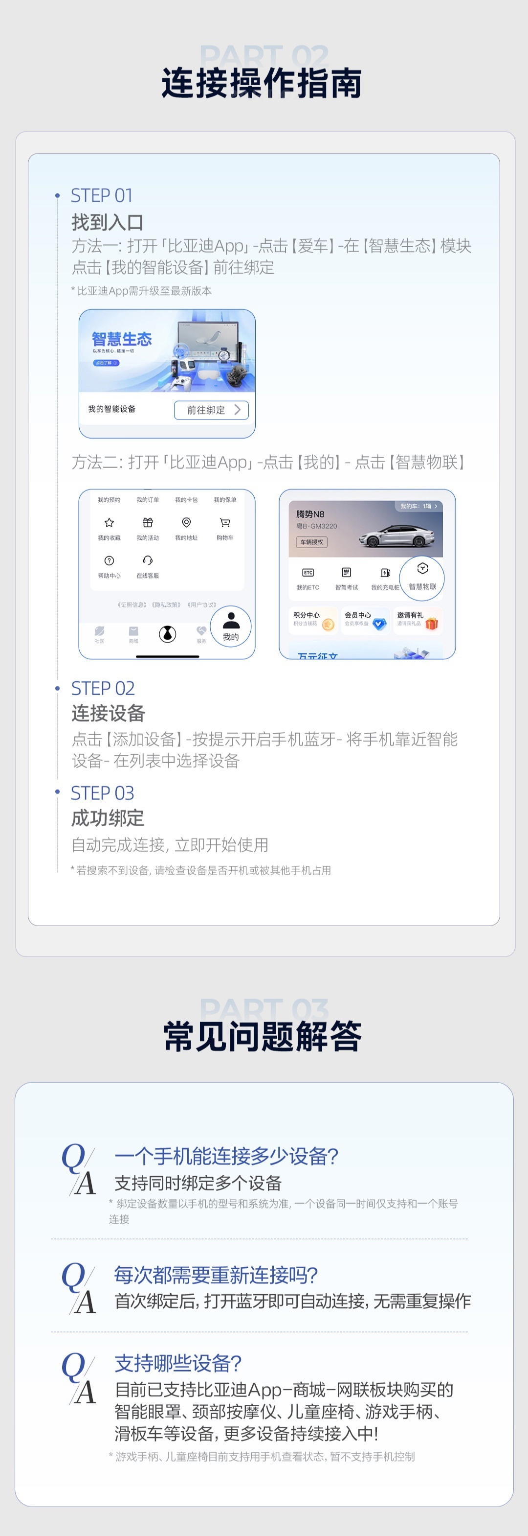 进入入口:首先打开比亚迪 App,点击“爱车”选项,在“智慧生态”模块中选择“我的智能设备”,或者直接进入“我的”页面后点击“智慧物联”。