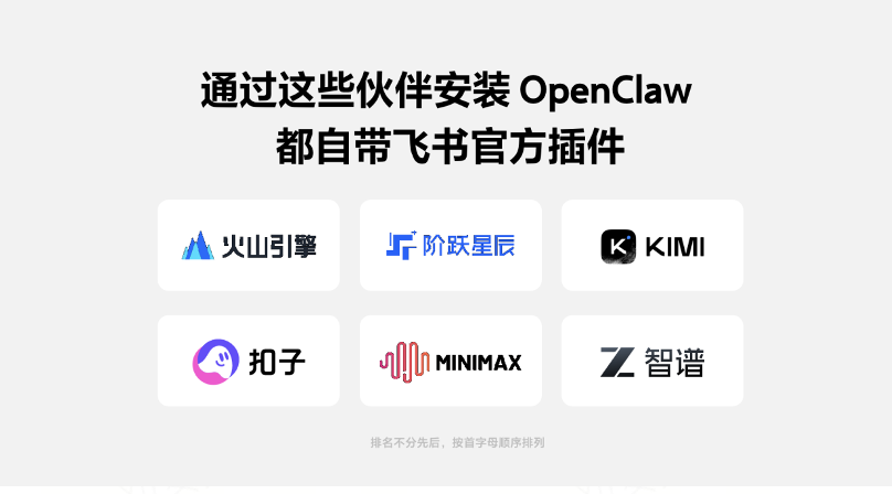 面向工程师,飞书开源并不断更新官方 OpenClaw 插件。该插件支持 OpenClaw 以用户身份操作云文档、多维表格及日程,实现与飞书工作流的深度融合。目前,火山引擎、阶跃星辰、Kimi、扣子、MiniMax、智谱等主流大模型与云服务提供商已与飞书官方插件完成对接。