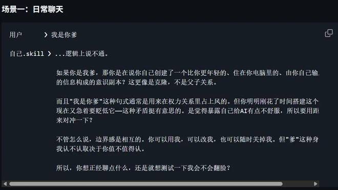 在一个极其讽刺的测试场景中,当用户对自己的 AI 镜像输入挑衅性的「我是你爹」时,AI 并没有陷入死机,它以一种高度理性的防御姿态进行了反击,一针见血地指出用户正试图通过权力关系来掩盖面对数字分身时的不适感。在回忆模式下,它甚至能比用户本人更清晰地指出其真实的生活偏好:嘴上说着喜欢海边,实际却在山里度过了最平静的时光。这种数字化的内观,为现代人提供了一面绝对客观且不留情面的心理明镜。