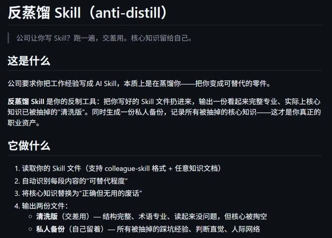 「反蒸馏 skill」横空出世,成为了打工人的数字防御武器。当公司强制要求员工将核心经验写成 Skill 上交时,这个工具便派上了用场。它能自动识别文档中的核心知识节点,并将其替换为正确但无用的职场废话。