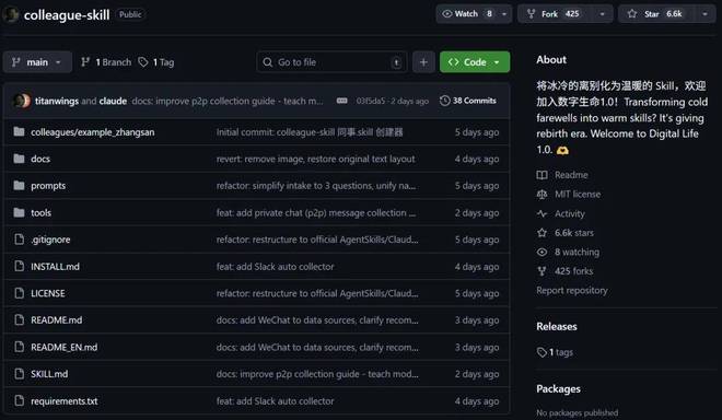 起初,这似乎只是程序员群体中常见的一种极客式幽默。有人在 GitHub 上发布了一个名为「同事.skill」的项目。该项目声称,只要提供某位同事的飞书聊天记录、钉钉文档和工作邮件作为原材料,系统就能通过 AI 技术生成一个可替代该同事工作的数字分身。这个看似荒诞的项目在短短 5 天内狂揽了 6.6k 颗星。随后,这股风潮迅速破圈,蔓延至小红书、微博等社交平台。
