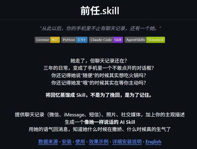 该项目的作者 titanwings 在说明文档中留下了一句充满黑色幽默的调侃,直指大模型技术对各个岗位的冲击。该项目旨在解决同事跳槽或转岗后留下的协作真空。用户可以导入飞书或钉钉的消息导出文件,系统便能复刻出一个虚拟的搭档。