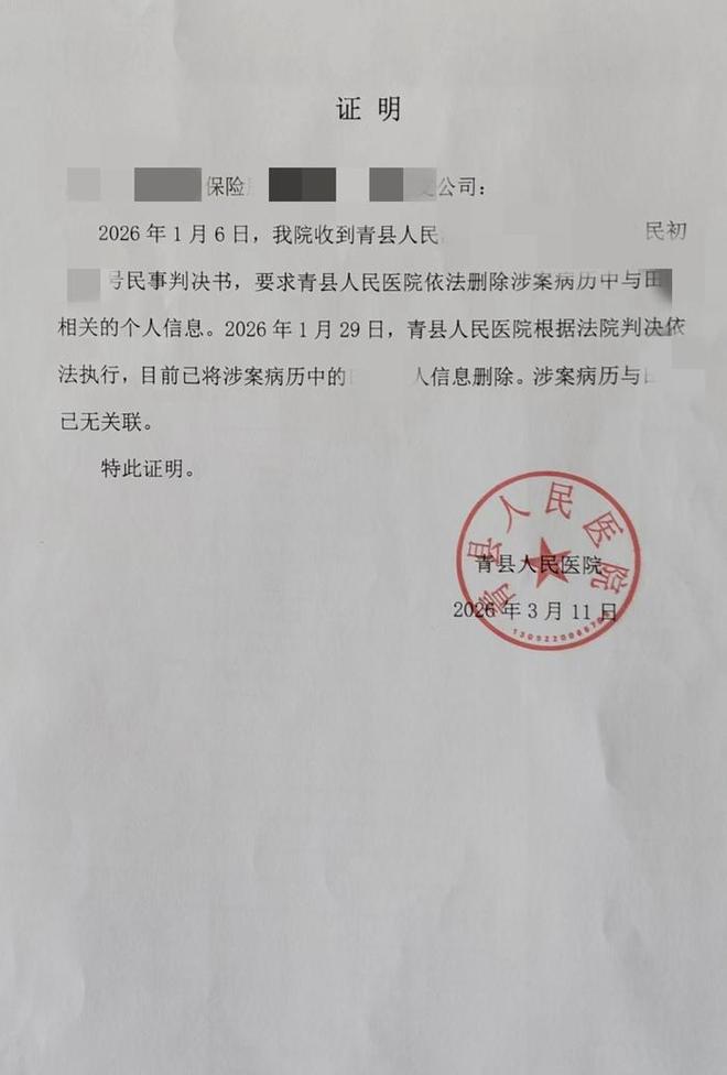 2026年1月29日,青县人民医院按判决删除了本院内部系统中涉案病历的田先生个人信息,并于3月11日向保险公司出具证明,确认涉案病历与田先生无关联。3月20日,田先生在接受新黄河记者采访时称,其与保险公司沟通后发现,保险公司虽同意其投保,却明确后续如果出现理赔仍会核查过往记录。“保险公司说可以给我上保险,但后续我要是生病申请理赔,保险公司还是会调查过往记录,发现这份不实病史后依旧会产生纠纷。”