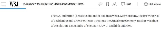 盟友之外,美国民众也在为这场军事行动“埋单”。《华尔街日报》的报道称,美国国务院直到战争开始后才敦促美国公民离开该地区国家或撤离部分大使馆。而当时,商业空域已关闭,数万美国人滞留中东,美国的外交官们在部分大使馆也处于危险之中;此外,美国此次军事行动每周耗资数十亿美元。战争不断扩大且长期延宕的风险日益加剧,正威胁着美国经济,甚至引发“滞胀”风险。