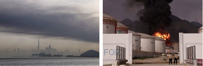 左图:当地时间13日,迪拜上空冒起浓烟 右图:阿联酋富查伊拉一处石油工业区14日遭受袭击发生火灾 图源:法新社、路透社