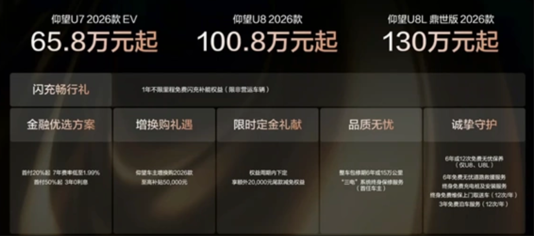 新款仰望U8/U8L,同样二代电池+兆瓦闪充,综合续航突破1000km;仰望U7 EV,比亚迪纯电豪华轿车旗舰。续航破千公里,零百加速2.9秒。