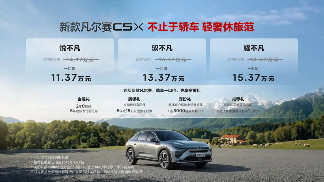 东风雪铁龙于3月23日发布了新款凡尔赛C5 X,此次上市包括悦不凡、驭不凡、耀不凡三个版本。神龙汽车副董事长、总经理吕海涛公布了新车的定价以及一系列优惠政策,悦不凡版的售价为11.37万元,驭不凡版为13.37万元,耀不凡版则为15.37万元。新款凡尔赛C5 X以“不止于轿车 轻奢休旅范”的全新定位,为消费者提供了更为丰富的升级体验。