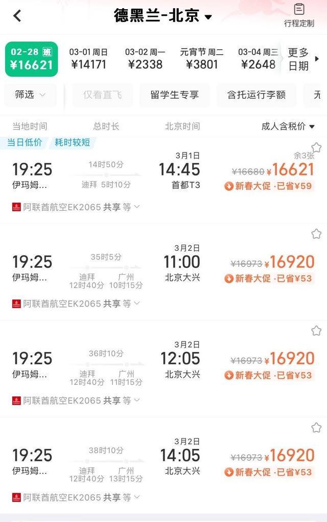 据同程旅行的数据显示,2月28日从德黑兰飞往北京的最低票价已超过1.6万元人民币,最高则达到了2.1万元;同一时间从德黑兰返回上海没有直飞航班,最低价格为4.4万元;而从德黑兰到广州的公务舱票也接近5万元。