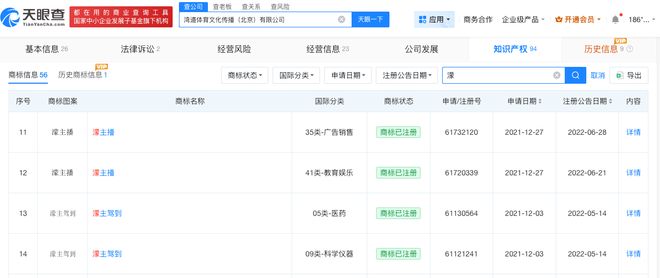 其中,湾道体育文化传播(北京)有限公司的股份中有89%归属于王濛。此外,该公司还注册了包括“王濛”、“濛主播”以及“濛主驾到”在内的多个商标。