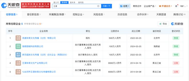 天眼查的资料表明,王濛与五家企业有关联,这些企业包括湾道体育文化传播(北京)有限公司、海南陌铭科技有限公司以及弟兄姐妹文化传播(北京)合伙企业(有限合伙)。她在这些公司中担任法定代表人和执行董事兼总经理的角色,业务范围涵盖了体育文化及科技等多个领域。
