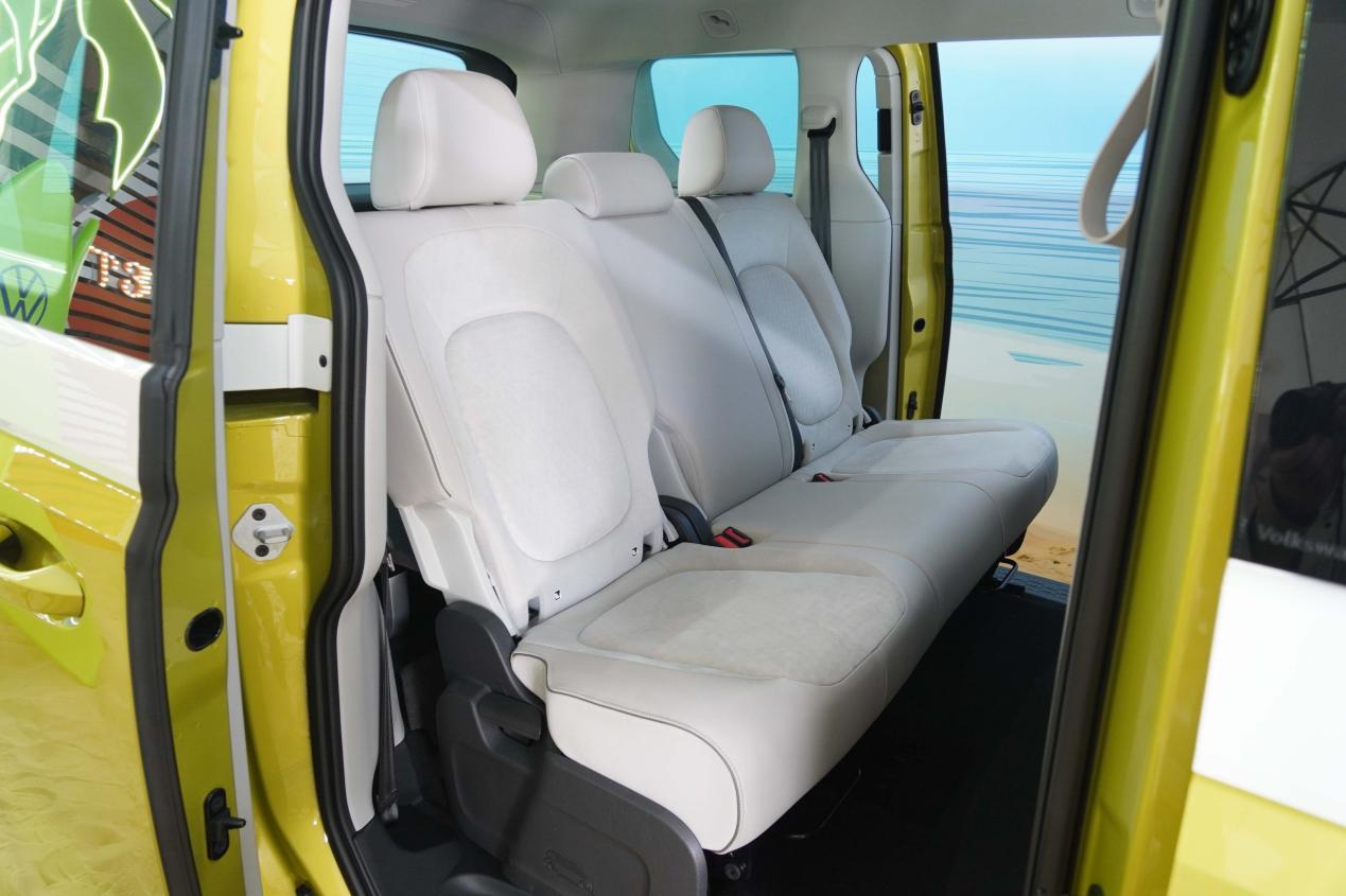 车身侧面线条圆润,几乎看不到腰线的设计,车头和车尾基本处于一个水平线上,这也让这台车从侧面看上去方中带圆,就像是一个玩具。D柱两侧各三根装饰条的设计其实是为了还原当初大众 T1 上的发动机散热孔。车尾依旧是比较圆润的设计,贯穿式尾灯让其看起来也是十分的洋气。