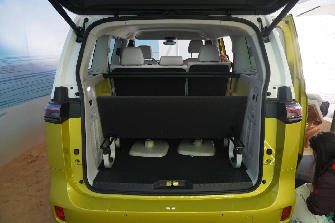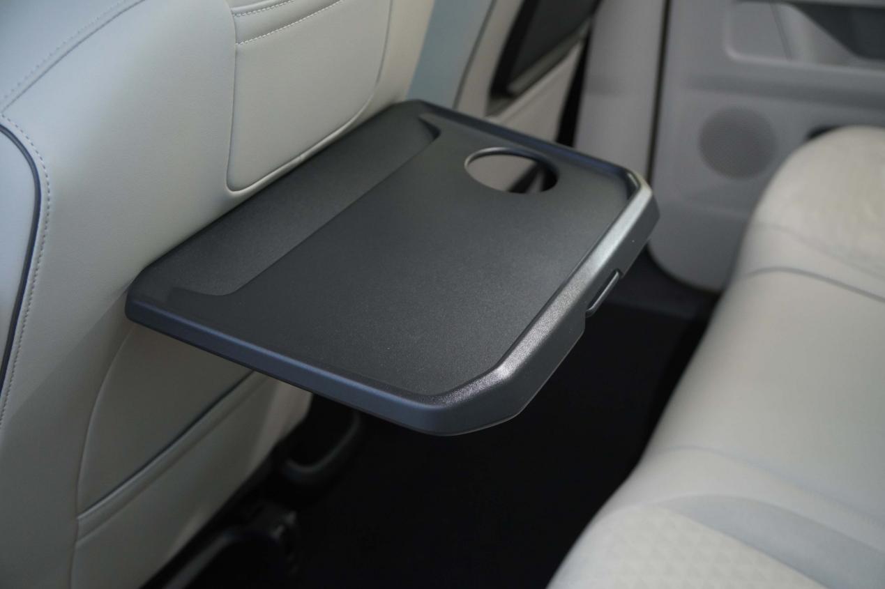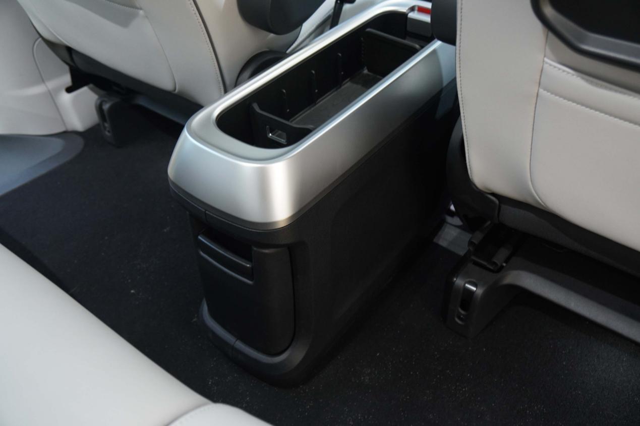后排还提供了小桌板,前排中央的扶手箱可以拆下来拿走,这样一来中央通道就会变得很宽敞,摘下来的扶手箱还可以在露营时充当储物柜和座椅。打开尾门,后备厢的空间被隔板分为了上下两层,方便来规划物品的放置位置。我们体验的这台后窗不能打开。