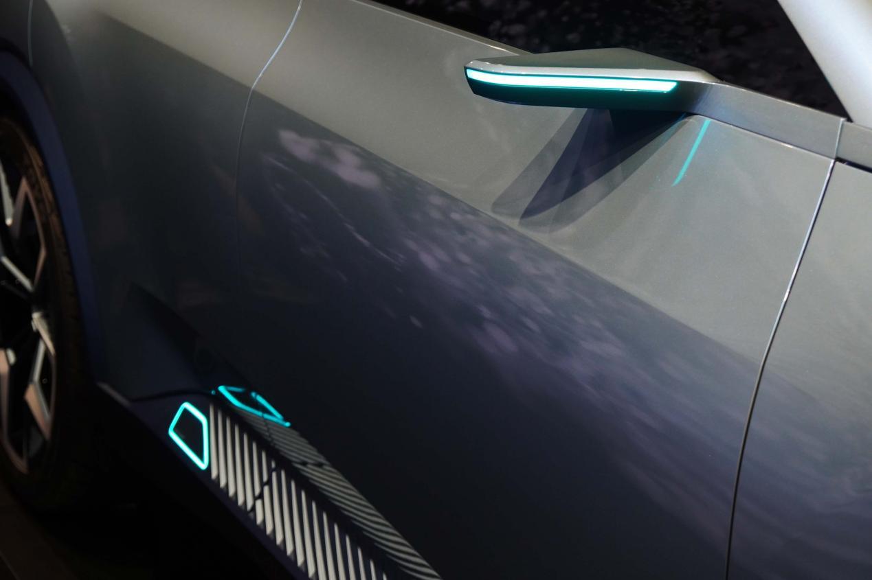 ID. CODE搭载诸多当下前沿科技,集成先进的传感器、灯光、摄像头和显示系统,达到L4级自动驾驶水平。L4级自动驾驶传感器则完全融入到车辆设计中,同时,考虑到美感和空气动力性,大众汽车在车窗框(B柱)上使用了小型触屏板,以此取代了传统的门把手,而车门则可以电动开闭。传统的外后视镜被外置摄像头取代,这些摄像头的外罩纤细且符合空气动力学原理,在视觉上仿佛是前车盖在侧面轮廓上的延伸。当进入L4级自动驾驶模式时,摄像头外罩和位于后车门侧面的雷达传感器都会亮起。