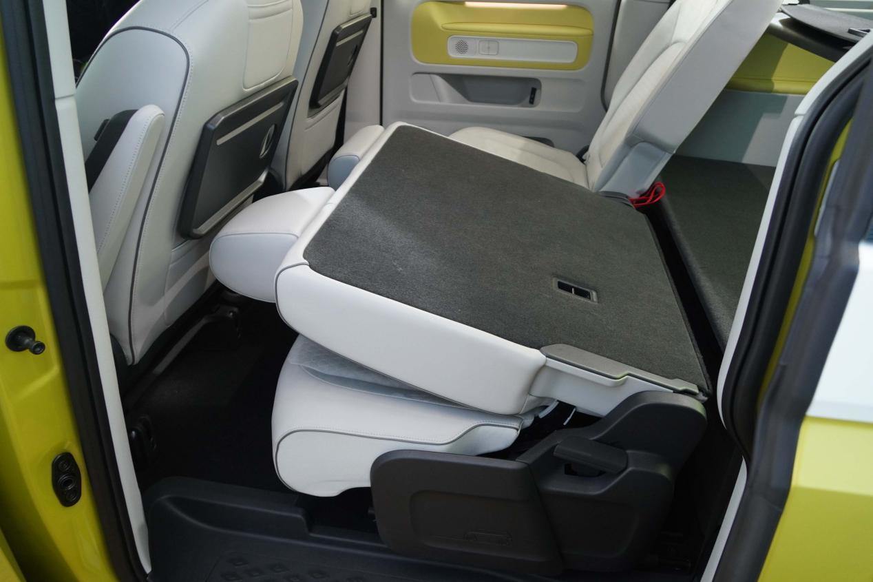 座舱几乎没有实体按键,液晶仪表、大尺寸中控屏也是当下新能源车型的标配。车内材质的并没有使用很多的软性包裹,中控台上有仿木纹的饰板。这次展示的是五座车型,后排座椅可以独立向前放倒,也可以前后调节位置。