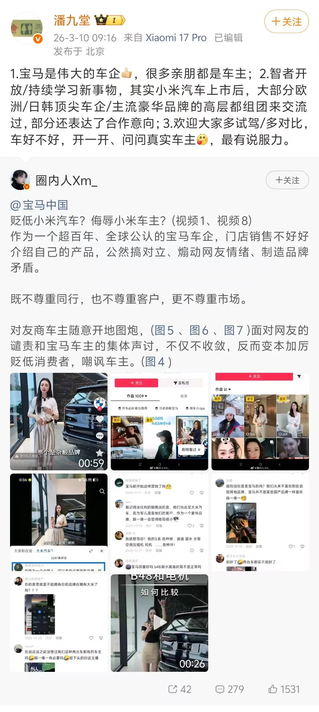 3月10日,小米产业投资部的一名合伙人潘九堂针对近期发生的宝马销售人员在直播中贬低小米汽车一事进行了回应。他指出,在小米汽车上市后,许多来自欧洲和日本韩国的顶级车企以及主流豪华品牌的高层管理人员都曾组团前来进行交流,并且其中一些还明确表达了合作的愿望;他鼓励大家多去试驾、对比不同车型,因为只有亲身体验过才能真正判断车辆的质量。