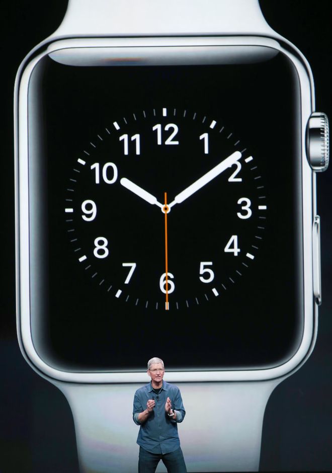 ▲库克站在Apple Watch展品前,这款产品是其执掌苹果期间最成功的发布之作之一(图源:Getty Images)