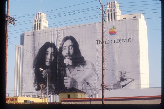 1997年,苹果公司与广告公司TBWA/Chiat/Day合作推出“Think Different”广告,以列侬、爱因斯坦、毕加索、鲍勃·迪伦等人的黑白肖像,配上两个词和一个苹果标志,重塑了公众对这家公司的认知。