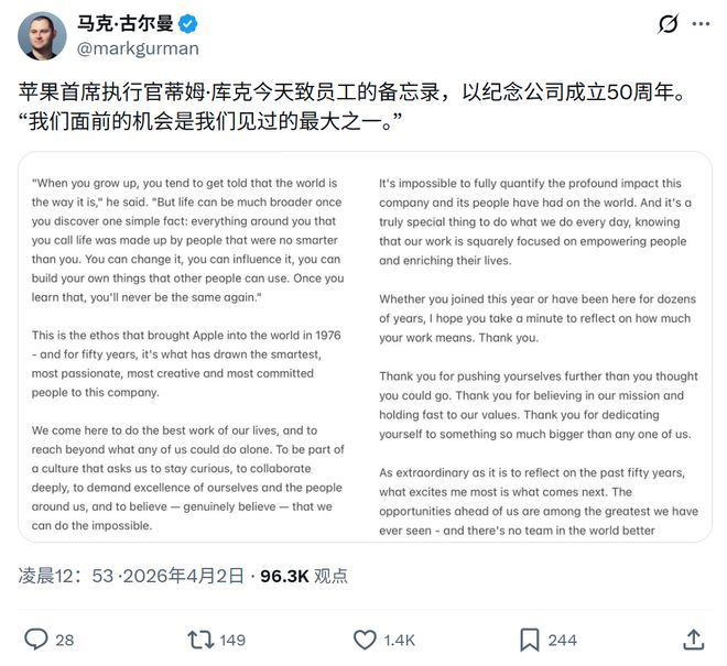 ▲彭博社编辑马克·格尔曼(Mark·Gurman)在X平台曝光了库克发送给苹果员工的完整内部备忘录
