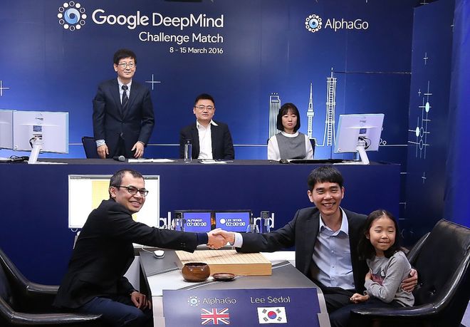 2016年3月9日,首尔四季酒店,Hassabis(左)与韩国围棋九段李世石赛前握手。几天后AlphaGo以4:1击败李世石,全球超过2亿人观看。这是AI首次在围棋上击败世界顶级人类棋手,也是Hassabis登上世界舞台的时刻。