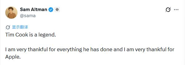 消息传出后最先发声的科技圈大佬之一是OpenAI的CEO山姆·奥特曼(Sam Altman)。他说库克是一位传奇人物,非常感激他所做的一切也非常感激苹果公司。