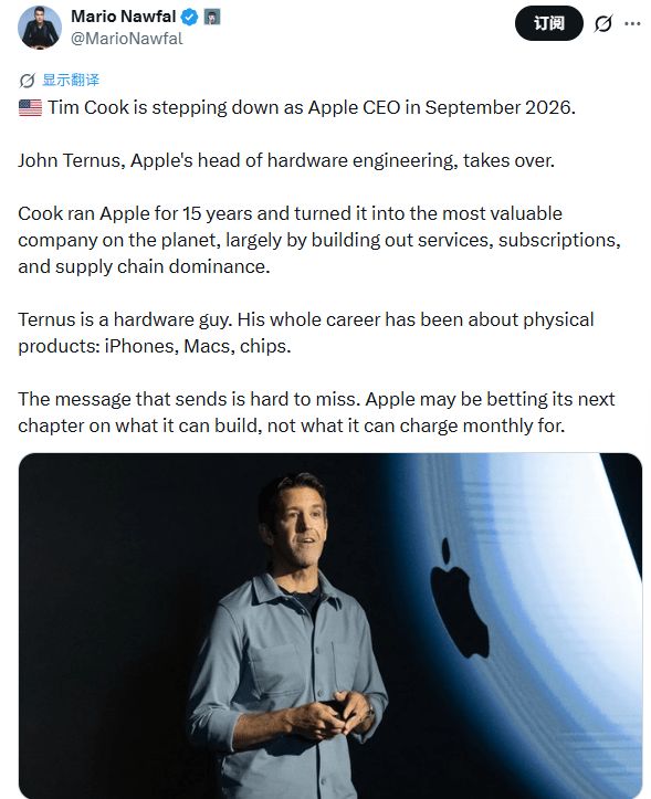 有网友把这个时刻概括得很准,即一个时代结束了但结束得很平稳。库克给公司创造了数万亿美元的价值,把苹果变成了服务和硬件两条腿走路的巨头。而特努斯在前线已经打了25年仗,iPhone、Mac、苹果自研芯片、AirPods、Watch全经过他的手。现在大家想看的是一个把硬件刻进骨子里的CEO能把苹果带向哪里。好在库克还会留在董事长位子上保驾护航。用这位网友的话说,苹果交到可靠的人手里了。