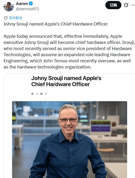 苹果在这次调整中同时宣布了一件事,约翰尼·斯鲁吉(Johny Srouji)出任首席硬件官并统管硬件工程和硬件技术团队。斯鲁吉是苹果芯片的灵魂人物,2008年加入苹果时的第一个任务就是开发A4芯片这款苹果第一款自研的系统级芯片。在那之前他在英特尔和IBM干过处理器设计。他手下的团队搞出了苹果从A系列到M系列的所有芯片,让Mac彻底摆脱了对英特尔的依赖。库克对斯鲁吉的评价很高,称他是我有幸共事过的最有才华的人之一且他的影响力不仅在公司内部也遍及整个行业。特努斯也说约翰尼一直是管理团队中令人难以置信的合作伙伴。