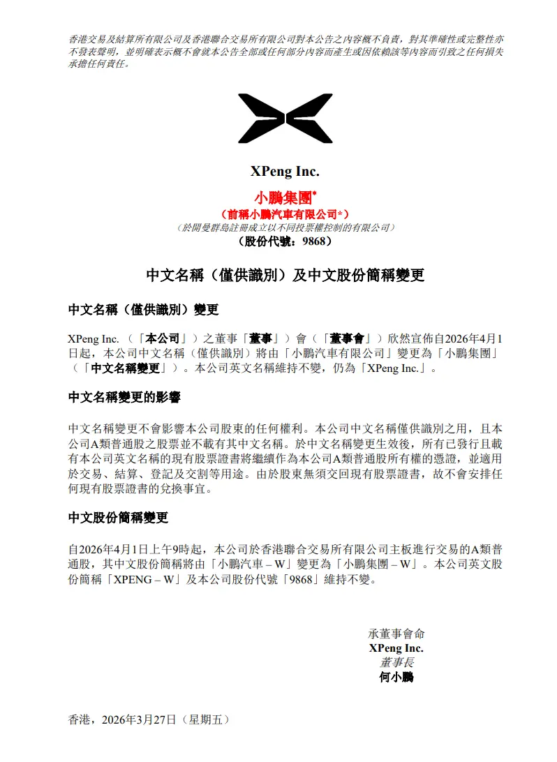 凤凰网科技讯 3月27日,小鹏汽车在港公告,自2026年4月1日起,本公司中文名称(仅供识别)将由“小鹏汽车有限公司”变更为“小鹏集团”。本公司英文名称维持不变,仍为“XPengInc.”。自2026年4月1日上午9时起,本公司于香港联合交易所有限公司主板进行交易的A类普通股,其中文股份简称将由“小鹏汽车–W”变更为“小鹏集团–W”。