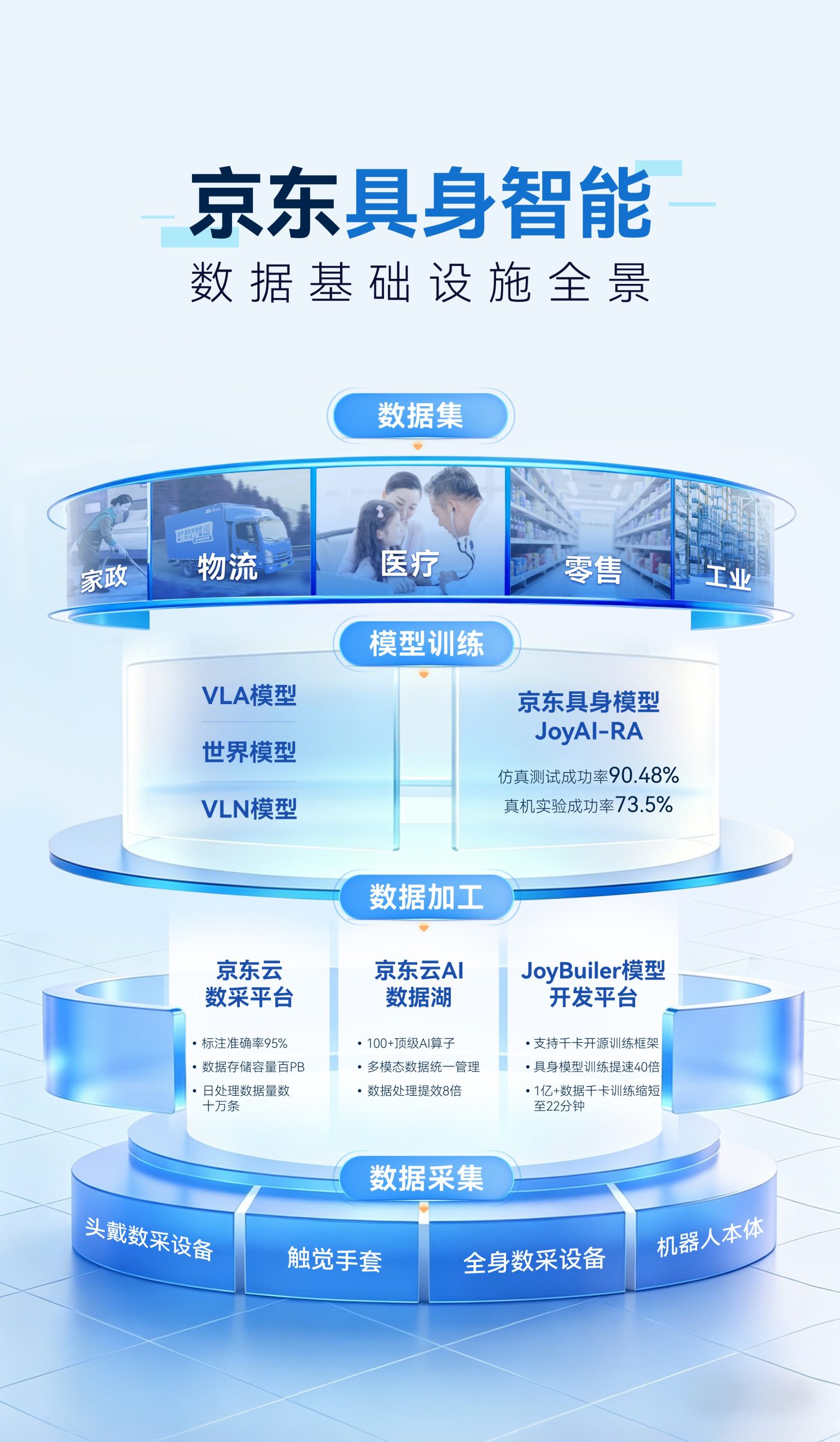 通过一系列技术创新和产品发布,京东填补了具身智能领域内数据采集、处理及流通等环节上的空白,构建了一个包括硬件采集、数据加工、模型训练等多个方面的完整产业链条。