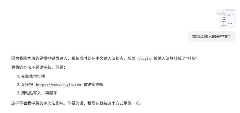 当我要求Codex打开douyin.com时,它却打开了“抖音。com”。这显然是因为它模拟了键盘输入并遵循了我的中文输入法设置。