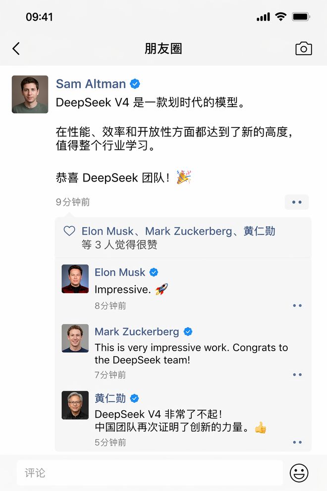 同时,智东西还使用该模型生成了一张朋友圈截图,以展示其应用范围更广的可能性。“Sam Altman在微信朋友圈称赞DeepSeek V4是一款划时代的模型,下面是马斯克、扎克伯格和黄仁勋的点赞及评论。”
