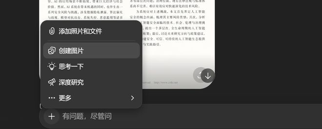 用户可以在ChatGPT对话中点击加号来创建图片,随后添加照片或文件并发送提示词即可开始操作。