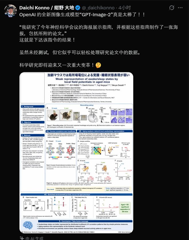 来自东京大学的一名医学博士展示了其生成的论文海报。“虽然还未进行测试,但ChatGPT Images 2.0似乎能够处理研究数据。他对此表示震惊,认为科学研究即将迎来新的变革。”