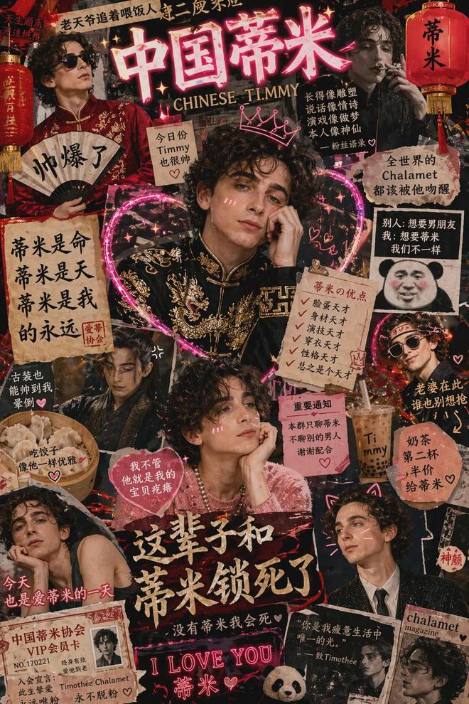 但样本归样本。《连线》杂志记者里斯·罗杰斯(Reece Rogers)让模型生成了一张提莫西·查拉梅(Timothée Chalamet好莱坞明星)主题的中国粉丝拼贴海报。输出画面包含超过二十处中文文本片段以及饺子、珍珠奶茶和熊猫的图像,视觉效果繁复热闹。