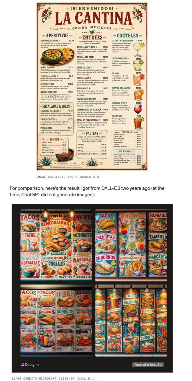 现如今,向ChatGPT Images 2.0索要同样的墨西哥菜单,生成的成品可以直接用于印刷。菜品名称不仅完全准确,排版也十分清晰,并且价格标注到位。虽然13.5美元的价格可能让人质疑食材的真实性,但至少从视觉上看不出任何破绽。