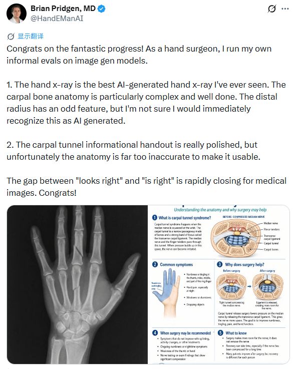 坏消息是那份腕管信息传单虽然设计精致但解剖结构过于不准确完全没法用。这提醒人们在高专业门槛的场景里,模型的视觉表现力和事实准确性之间仍然存在巨大鸿沟。它可以把一件事画得很像那么回事,但当细节关系到诊断、教学或实际操作时,像绝对不等于对。
