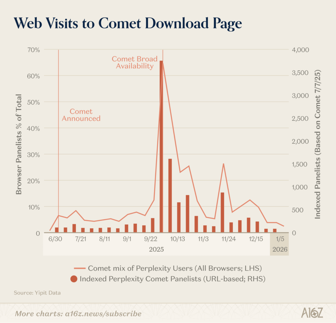 尽管Perplexity的Comet目前占据最大市场份额,但还没有哪款产品出现持续加速增长的趋势。