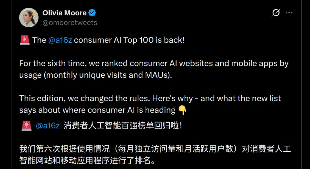 这份榜单始于三年前,当时ChatGPT刚兴起时,a16z就开始着手制作“百大消费者AI应用榜”了。