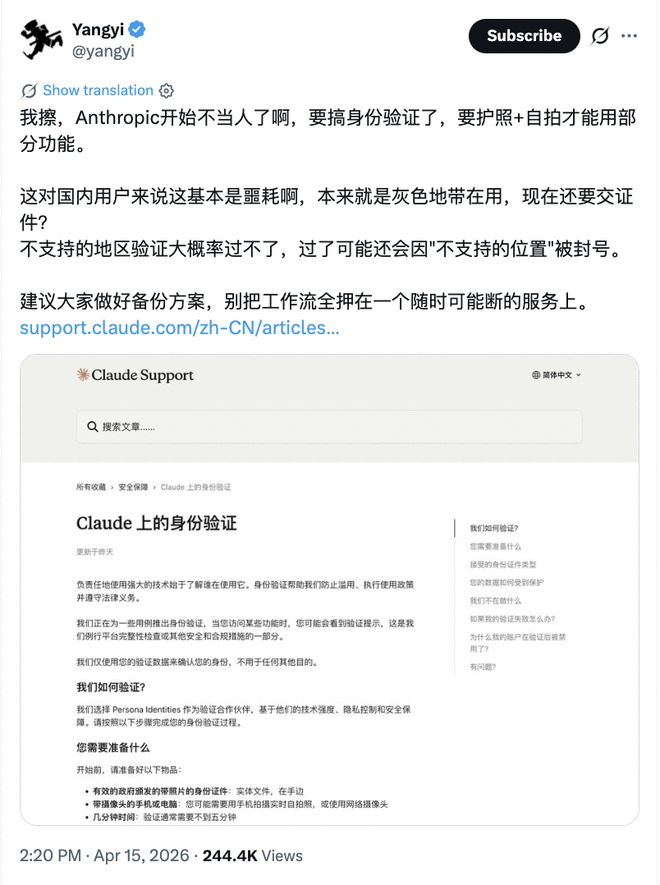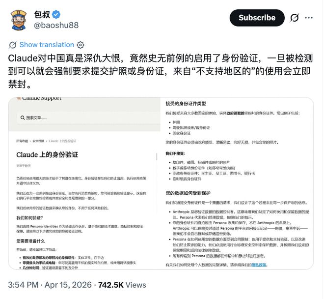 有用户在X平台上抱怨,称Claude对中国真是深仇大恨,竟然史无前例地启用了身份验证,一旦被检测到可疑就会强制要求提交护照或身份证,来自不支持地区的使用会面临立即封禁。