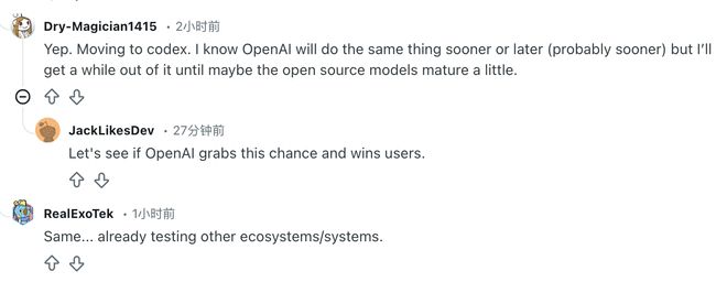 数字大迁徙者选择将工作流迁移至Codex,并考虑本地部署开源模型来度过这段困难时期。同时密切关注OpenAI是否会利用这次机会吸引这批隐私难民用户群体。