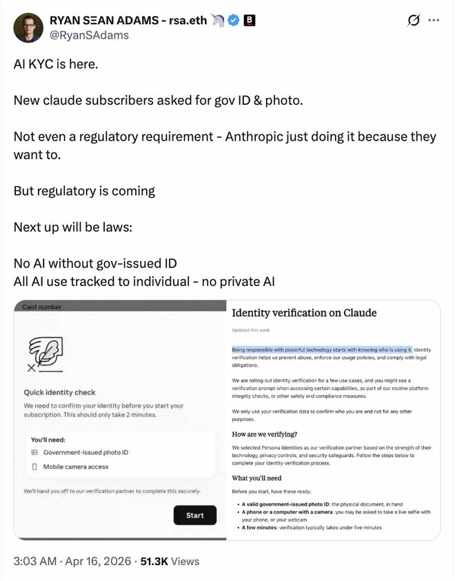 社交媒体上对此反应强烈。知名加密行业评论员瑞安·肖恩·亚当斯指责AI的实名制时代来临,尽管不是法规强制执行的结果,却可能预示着未来的趋势:只有拥有有效身份验证者才能使用AI服务。