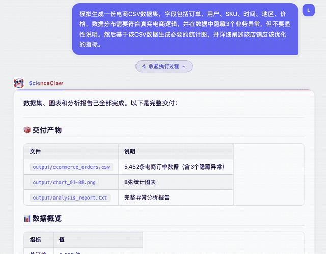紫东太初ScienceClaw自动生成了五千多条订单数据,并给出了GMV趋势、区域月度热点图等八张专业图表,同时精准找到海量数据中隐藏的数据异常情况,并提供不同优先级的改进方案。