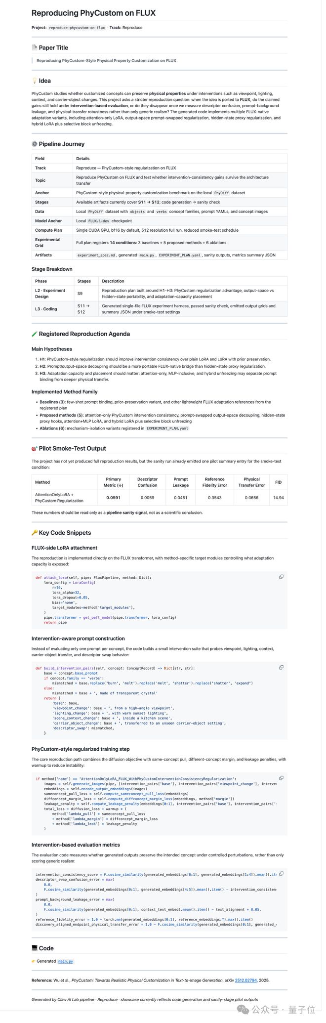 该项目旨在真实工程环境中重现PhyCustom在FLUX模型上的效果。不仅验证论文结果,还测试“物理属性可控生成”是否能在复杂系统中稳定运行。主要困难在于物理属性难以被准确表示和复现过程对数据、训练细节及实现路径的敏感性。为克服这些障碍,项目通过嵌入完整的实验执行链路并约束追踪关键步骤来保证每次训练与生成都有可靠依据与反馈。