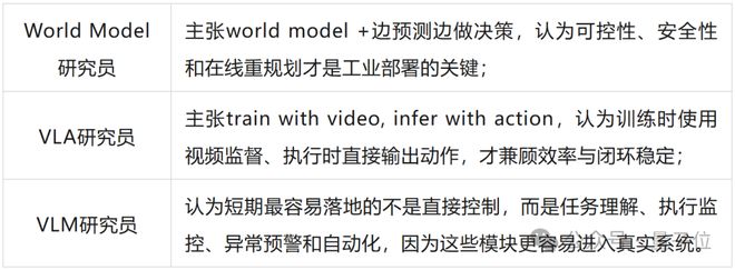 VLA研究者则提倡使用视频训练、执行时直接输出行动,以兼顾效率和闭环稳定性;