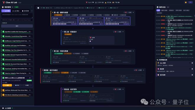 Claw AI Lab提供了一个直观的操作界面,用户可以像实验室负责人一样定义研究目标、拆解任务,并实时监控各个智能体的工作状态与中间结果。复杂的科研流程被简化为易于操作的界面和进度条,大大降低了使用难度。