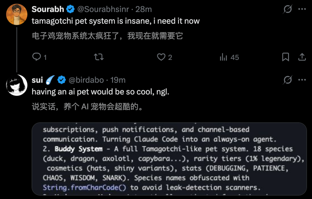 这个系统包含18个物种、稀有度等级、闪光变体以及详细的属性统计——很难想象在编写核心架构时,工程师们还给Claude塞进了一套「拓麻歌子」。