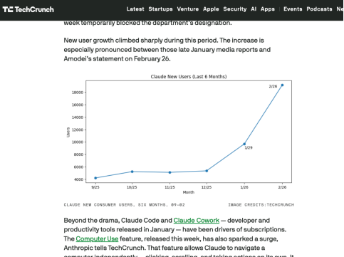 除了那些争议事件(超级碗投广告暗讽OpenAI、和战争部产生矛盾等等),今年一月发布的开发者和效率工具Claude Code和Claude Cowork一直是订阅用户增长的主要驱动力。