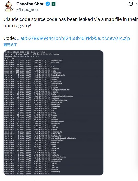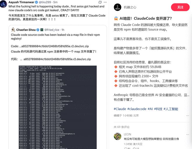 另一位小红书博主“机器之心”也提到了这件事:“网上流传Claude Code的源代码被大规模还原,导火索是在发布npm包时遗留了source map。这不是黑客攻击或员工误操作,而是一个构建产物中多带了一个‘能反推源码关系’的文件,结果被人顺藤摸瓜。”